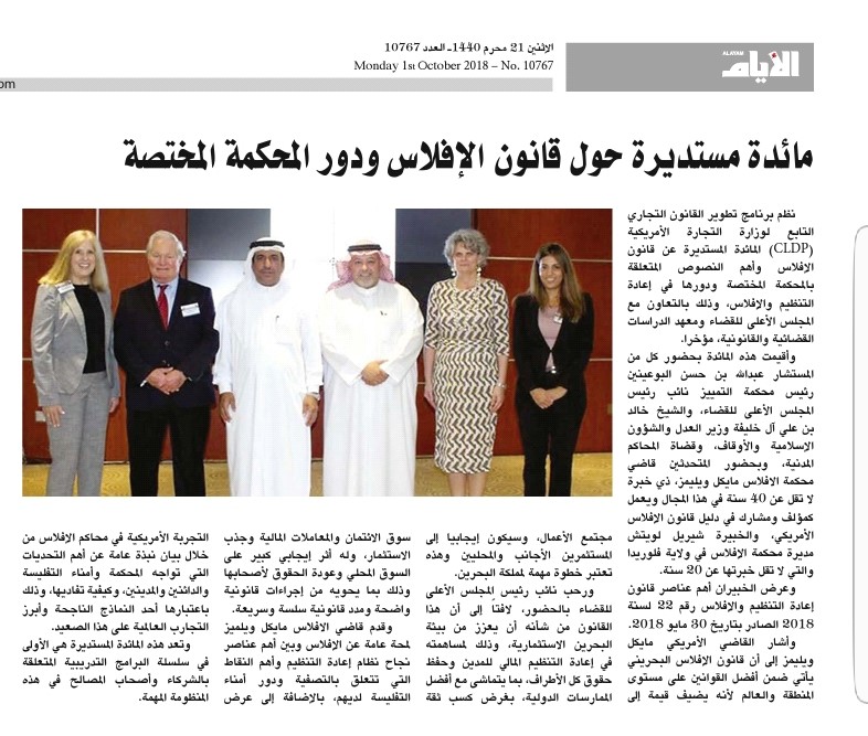 From September 26-27, in Manama, CLDP, in coordination with the Supreme Judicial Council of Bahrain, conducted a judicial training on the development of a bankruptcy system in Bahrain for 16 local judges. Bahrain recently adopted a new bankruptcy law in accordance with international best practices, which allows for restructuring proceedings. CLDP experts included the Hon. Michael Williamson, chief judge of the U.S. Bankruptcy Court of the Middle District of Florida, who focused on reorganization case studies, while also sharing practical experience on bankruptcy case management in the U.S. system. Participants learned about the process by which bankruptcy cases are adjudicated in the U.S. Topics included how a transparent and predictable bankruptcy system can help attract foreign investment, the role of court automation and case management technology in ensuring efficient and transparent adjudication of disputes, and valuation methods and the enforcement of cross border bankruptcy judgments, which is becoming increasingly important with the global nature of commercial lending. CLDP will be actively promoting the new bankruptcy law in Bahrain to help train a new cadre of bankruptcy trustees as well as to train the judges that will preside over insolvency proceedings, alongside the government stakeholders that will regulate the bankruptcy system.