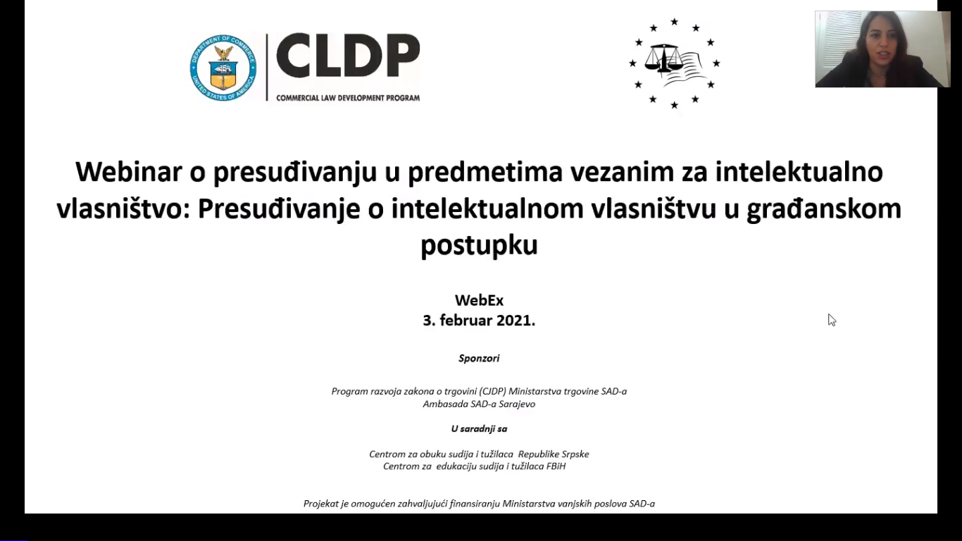 On February 3, CLDP, in coordination with U.S. Embassy Sarajevo, led a second webinar on intellectual property (IP) adjudication for judges and judicial staff in Bosnia-Herzegovina (BiH). Experts for the webinar included a U.S. federal judge and the head of Lanaco, a leading information and communication technology company in BiH. The webinar included presentations on: (1) how U.S. courts assign valuation of IP for determining damages, (2) challenges of copyright protection for computer software, databases, and related legal protection of database manufacturers, and (3) case studies on challenges to copyright protection with a focus on databases. This program is part of CLDP’s ongoing effort to support BiH’s ability to promote and protect IP rights. CLDP’s assistance with judicial capacity building furthers the expansion of democratic institutions and facilitates fair and reciprocal trade and investment.