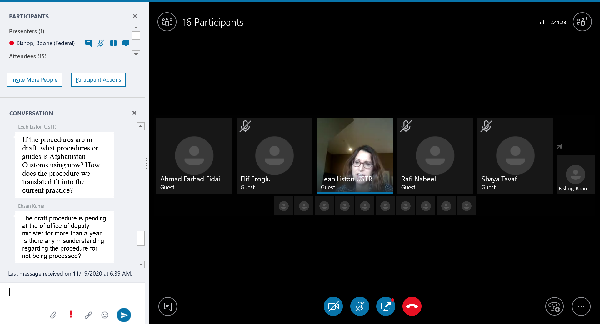 On November 19th, CLDP hosted a virtual consultation to discuss Afghanistan’s Customs Act and Customs Valuation Procedures. Participants from the U.S. included officials from the United States Trade Representative (USTR), United States Customs and Border Protection (CBP), Departments of State, Department of Treasury, USAID, and the International Trade Administration (ITA). Participants from Afghanistan included officials from the Legal Board of the Ministry of Finance (MoF), the Office of the Chief Legal Advisor to the President, Afghanistan’s Customs Department, and the Ministry of Industry and Commerce. This consultation was a direct request from the Government of Afghanistan as a follow-up to a review conducted by U.S. customs experts on both customs valuation measures. In April, as a request from the Afghan mission in Geneva, CLDP translated Afghanistan’s Customs Valuation Procedures and Customs Act from Dari to English. CLDP then coordinated their submission to the WTO Secretariat and shared the documents with experts from CBP and USTR for their review. After an in-depth review of both measures, the experts consolidated a list of questions and comments that CLDP shared with the Legal Board of the Ministry of Finance (MoF) in Afghanistan. The officials from the MoF formally responded to the questions and requested CLDP to create a working group to have in-depth consultations on how to assist Afghanistan in amending the legal documents so that they meet their obligations to the WTO’s Agreement on Customs Valuation. The meeting was both productive and engaging. Experts discussed the parts of the legal text that were inconsistent with Afghanistan’s commitments to the WTO and put together an action-plan for incorporating the proposed changes. Officials from Afghanistan also provided an update on the status of the amendments and gave a detailed description of the challenges they face in both passing the relevant legislation and implementing it at the borders. The meeting also helped facilitate inter-ministerial coordination in Afghanistan, which has been a significant challenge for our counterparts who have been working on his initiative. CLDP will host a follow-up meeting with the same officials within the next month. These series of consultations will assist Afghanistan in meeting the requirements set out in the WTO’s Agreement on Customs Valuation and will help Afghanistan incorporate valuation methods that are fair, transparent, and in line with international standards.