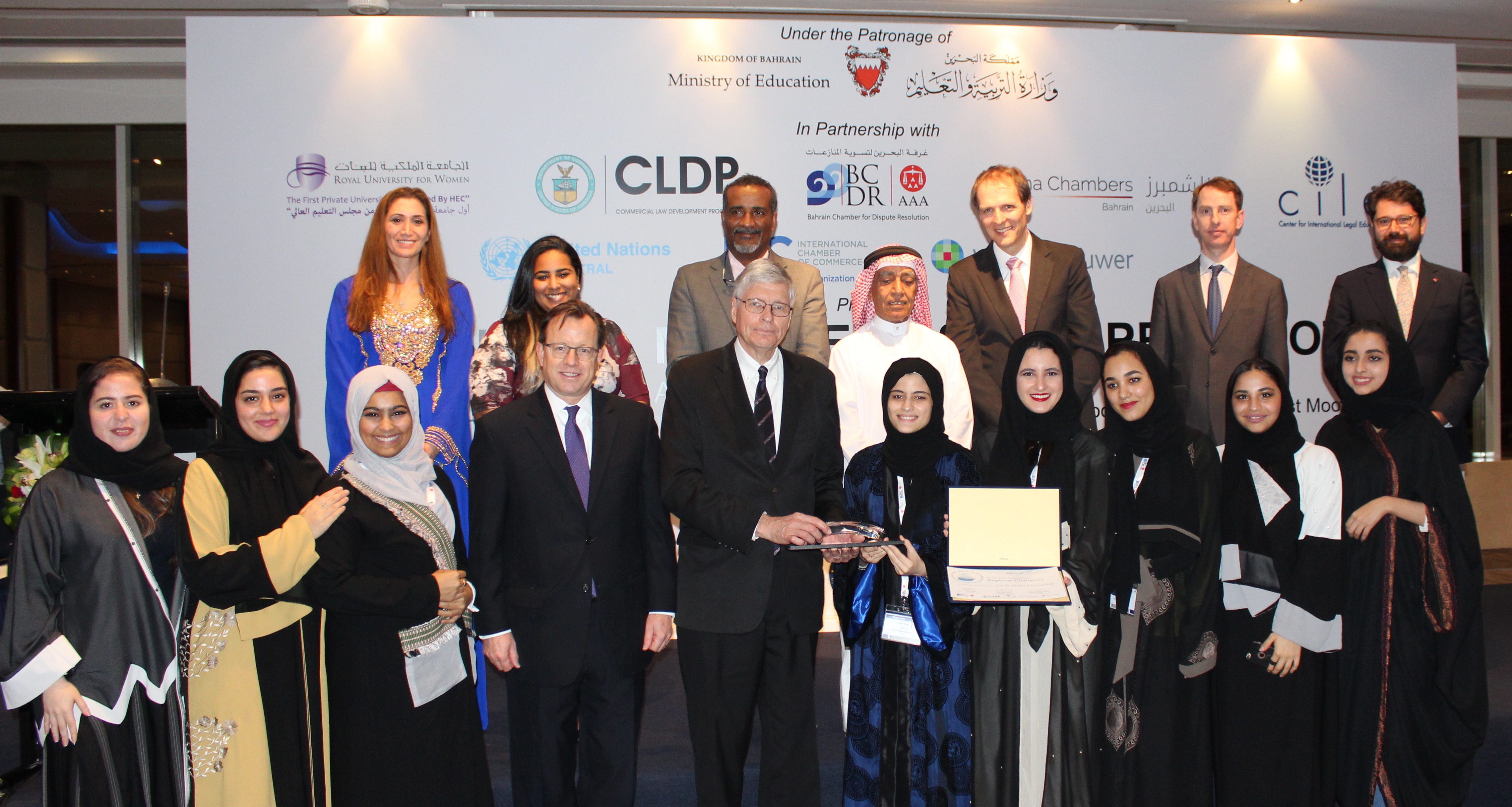 On February 19-23, CLDP, in partnership with the Royal University for Women, the Bahrain Chamber for Dispute Resolution, Mena Chambers Bahrain, UNCITRAL, and ICC, hosted the 8th Annual Middle East Vis Pre-Moot at the Royal University for Women in Manama, Bahrain.  The program brought together 15 teams consisting of over 90 students from Afghanistan, Bahrain, Iraq, Jordan, Kuwait, Lebanon, Saudi Arabia, Sri Lanka, Tunisia and the United Arab Emirates for extensive clinical training in oral advocacy as well as simulated arbitrations.  The program consisted of three days of training and two days of competition.  The training was conducted by former Vis Moot champions and mentors, and Professor Ronald Brand from the Center of International Legal Studies, University of Pittsburgh.  Additionally, the competition was arbitrated by over 70 legal practitioners from across the globe.