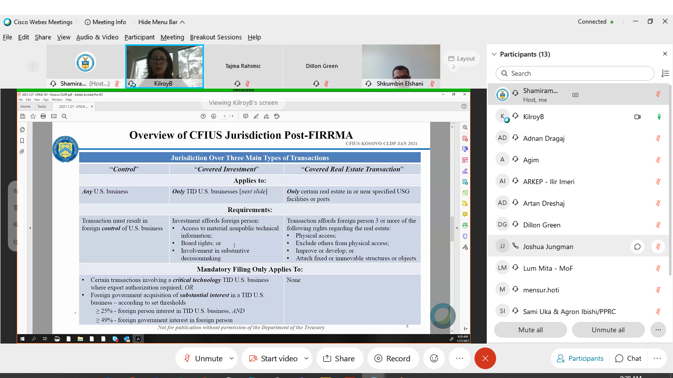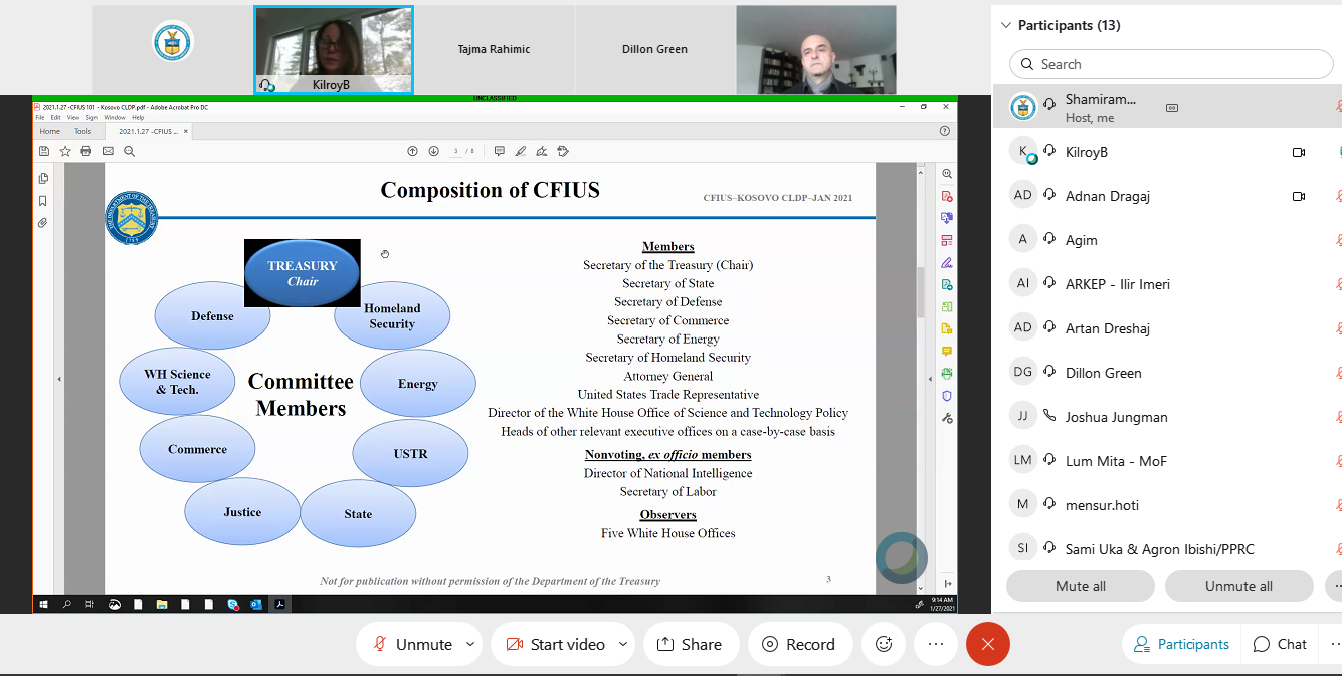 On January 27, CLDP, in partnership with the U.S. Treasury Department, organized a webinar on the investment screening mechanism in the United States, Committee on Foreign Investment in the United States (CFIUS). Treasury Department provided an overview of CFIUS emphasizing its limited role and focus on national security. Kosovar counterparts indicated that Kosovo does not currently have an investment screening mechanism in place. This webinar is the final one in the series and part of larger technical assistance efforts to counter malign economic activity in Kosovo through foreign direct investment (FDI), telecommunications, and procurement.