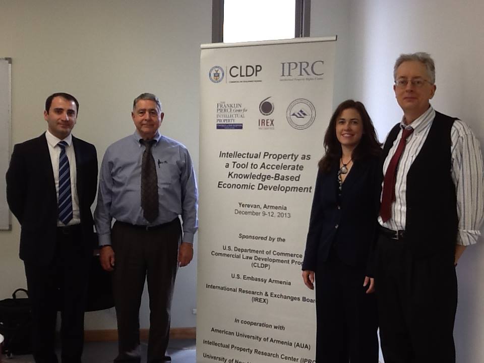 CLDP helped to support the development of intellectual property as a tool to accelerate knowledge-based economic development in Armenia through a technical assistance program and an assessment trip, which took place on December 9-12, 2013 in Yerevan, Armenia. Professors and IP specialists from the University of New Hampshire School of Law traveled to Armenia to spend a week training professors and faculty members from the American University of Armenia and law schools in Armenia in the development of intellectual property curriculum, intellectual property instruction, and the creation of an intellectual property legal clinic. Topics discussed included global innovation and the commercial market, trademarks and related forms of IP protection, patents and trade secrets, patent licensing, IP management principles and practice, and copyrights. Through this initial exchange program and subsequent technical assistance, universities in Armenia aim to develop and improve their intellectual property curricula, develop trainings for instructors and faculty, establish cooperation between international IP institutions and law schools; and develop IP legal clinics. In tandem with other ongoing IPR-related programs, CLDP's work will continue to contribute to the improved protection and enforcement of intellectual property rights in Armenia.